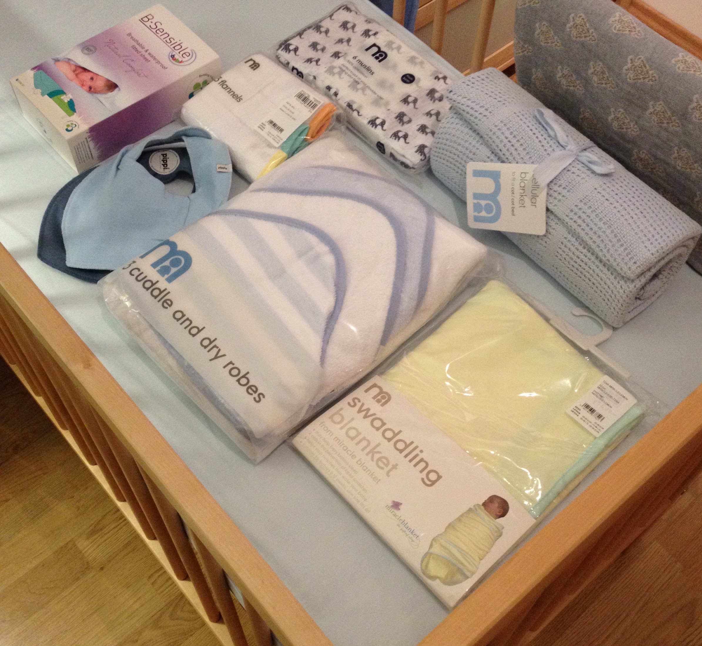 Esialgu oli mul plaanis Debenhamsist osta üks vannilinade-rätikute kompleks, mida siis edaspidi beebiga kasutada, aga pärast Mothercare-i valikuga tutvumist otsustasin siiski kapuutsiga rätikute 3-paki kasuks, mis maksis 15€, värvi valikus oli ka beežid rätikud, kuid Teet otsustas sinised valida 🙂 Kui beebi kasvab ja tekib vajadus suuremate vannilinade järgi eks siis saab osta ka selle Debenhamsi koplekti, kus lisaks vannilinadele ka käte- ja näorätt.