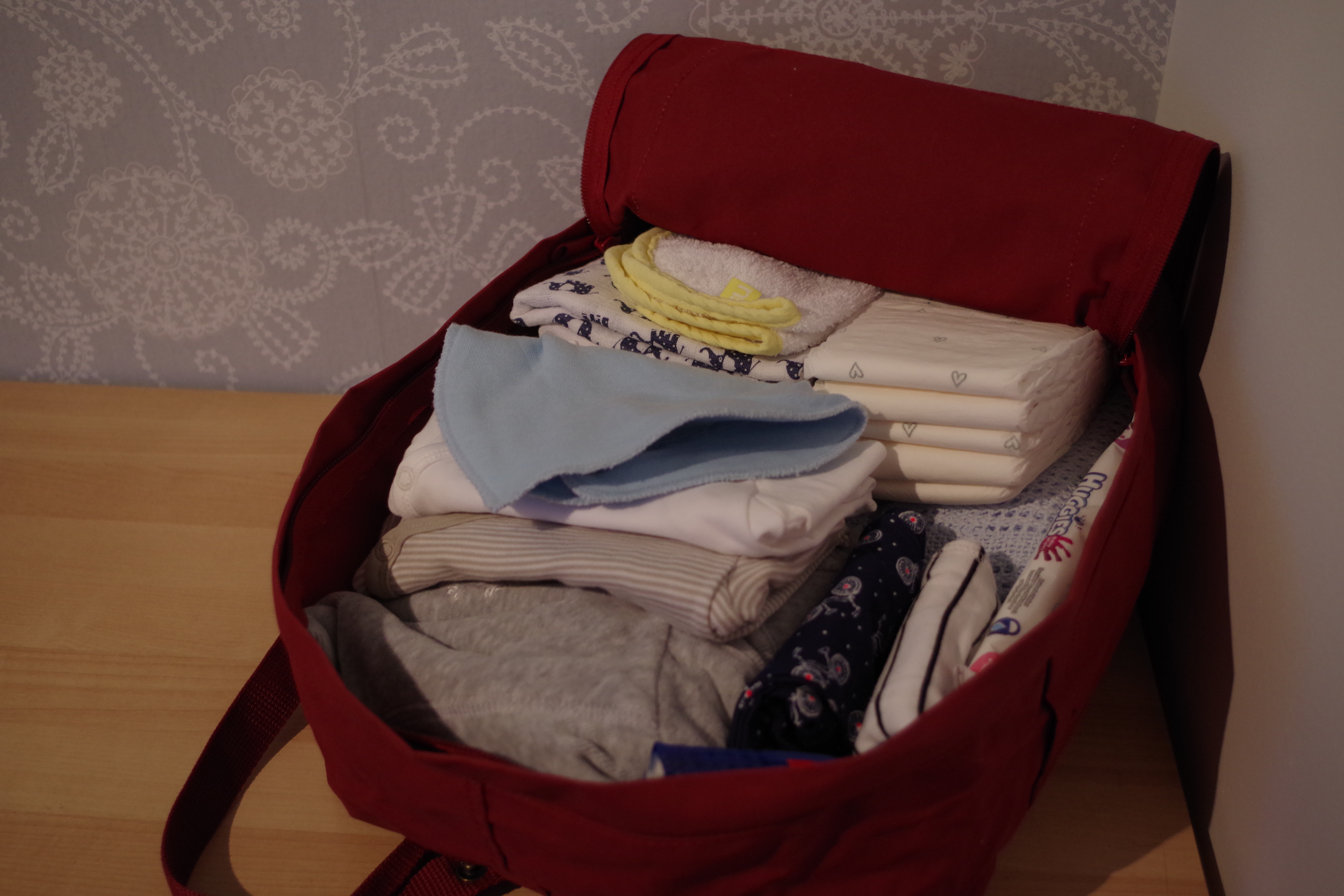 Proovisin järgi ka, et kuidas asjad siis uude kotti mahuvad – ilma suurema vaevata läks kotti: tekk, 5 mähet, üks aluslina, kaks marlilappi, üks väike flanellrätt, niisked salvärtid, tavalised salvärtid, kaks paari pükse, kaks body, üks kaelarätt ja paksem kombe. Lisaks jäi veel kasutamata esisahtel, kuhu saan nipet-näpet asju panna ja küljetaskud, kuhu näiteks veepudel hästi sobiks. Eks see, mida reaalselt seal kotis kaasas kandma hakkame selgub, siis kui see aeg käes on, aga ma usun, et esmase mahu-testi on kott läbinud küll.