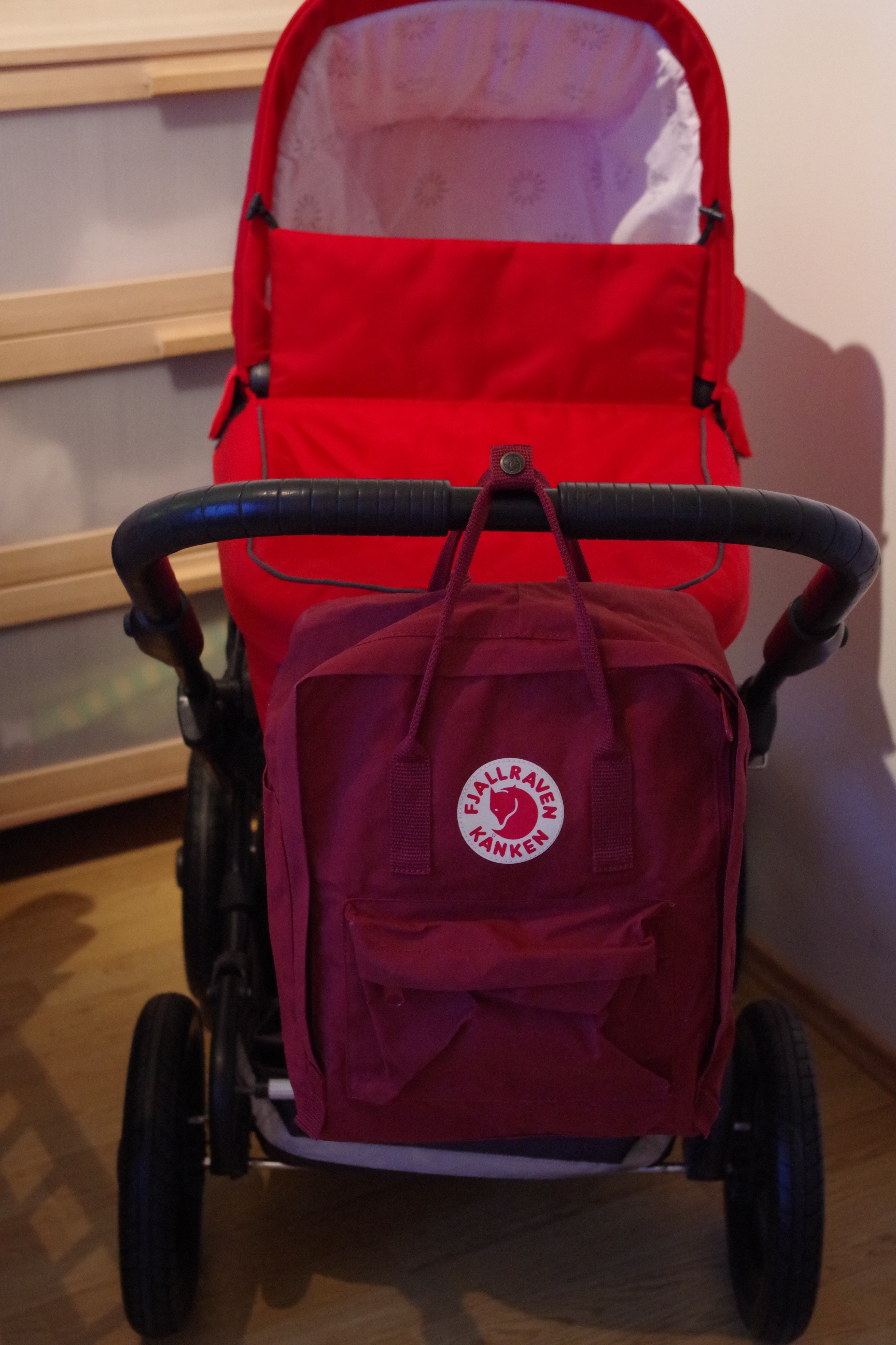 Valituks osutus Fjällräven Kanken Classic suuruses seljakott, värvuseks Ox Red. Värvi valisin mina, sobib me punase käruga ja tumepunasena on ühtviisi sobiv nii mulle kui ka Teedule (pealegi poetasin ma selle kingituse kuuse alla nii, et Teedu jaoks oli see hoopis üllatus, teda ootas koti sees veel ka termo joogipudel, mida ta talvel rattaga sõites nüüd kasutada saab ja miks mitte ka tulevikus miinuskraadidega kärutades).