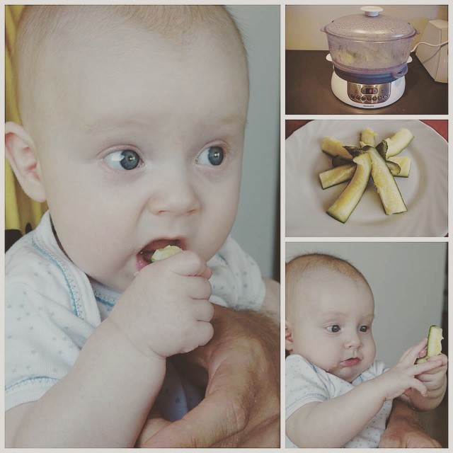 Tänase sünnipäeva puhul ei andnud me lapsele ei maasikaid- jäätist-makarone vaid hoopis mahe suvikõrvitsat (mille ostsime Mahemarketist). Kuna Jens veel iseseisvalt ei istu, siis pole me veel ka söögitooli ära ostnud ning oma suvikõrvitsa ampsud tegi ta hoopis issi süles. Tundub, et suvikõrvitsat võime täitsa vabalt veel pakuda, kuna JJ sõi seda nii nagu ta oleks seda alati söönud. Lutsustas ja plödistas, osa läks suhu ja osa ikka maha ka. Ma arvan, et koguseliselt sai ta söödud maksimaalselt 2 teelusikat, võib olla ka vähem.