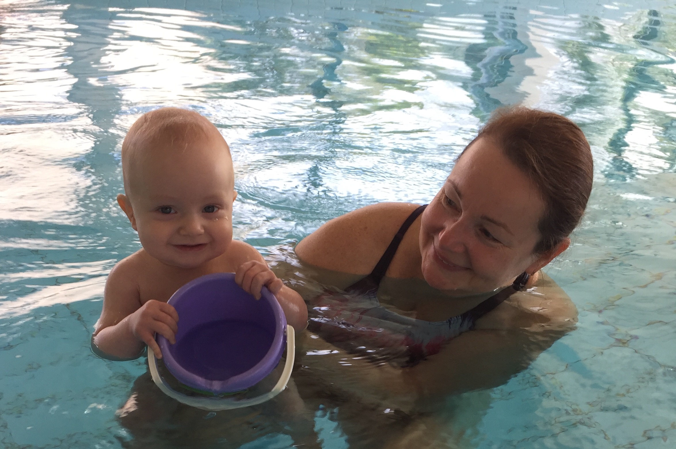 JJ oli algul päris nukker, kui oma Mammaga vette läks, ikkagi esimene kord basseinis ja emme ju kaasa ei tulnud (varasemalt olime kevadel käinud Magdaleenas beebide ujutamises). Aga pärast mõningast sulistamist ja teiste beebide saabumist läks tuju juba päris heaks. Nii ta siis ujus seal koos palliga ja eriline lemmik oli väike ämber 🙂