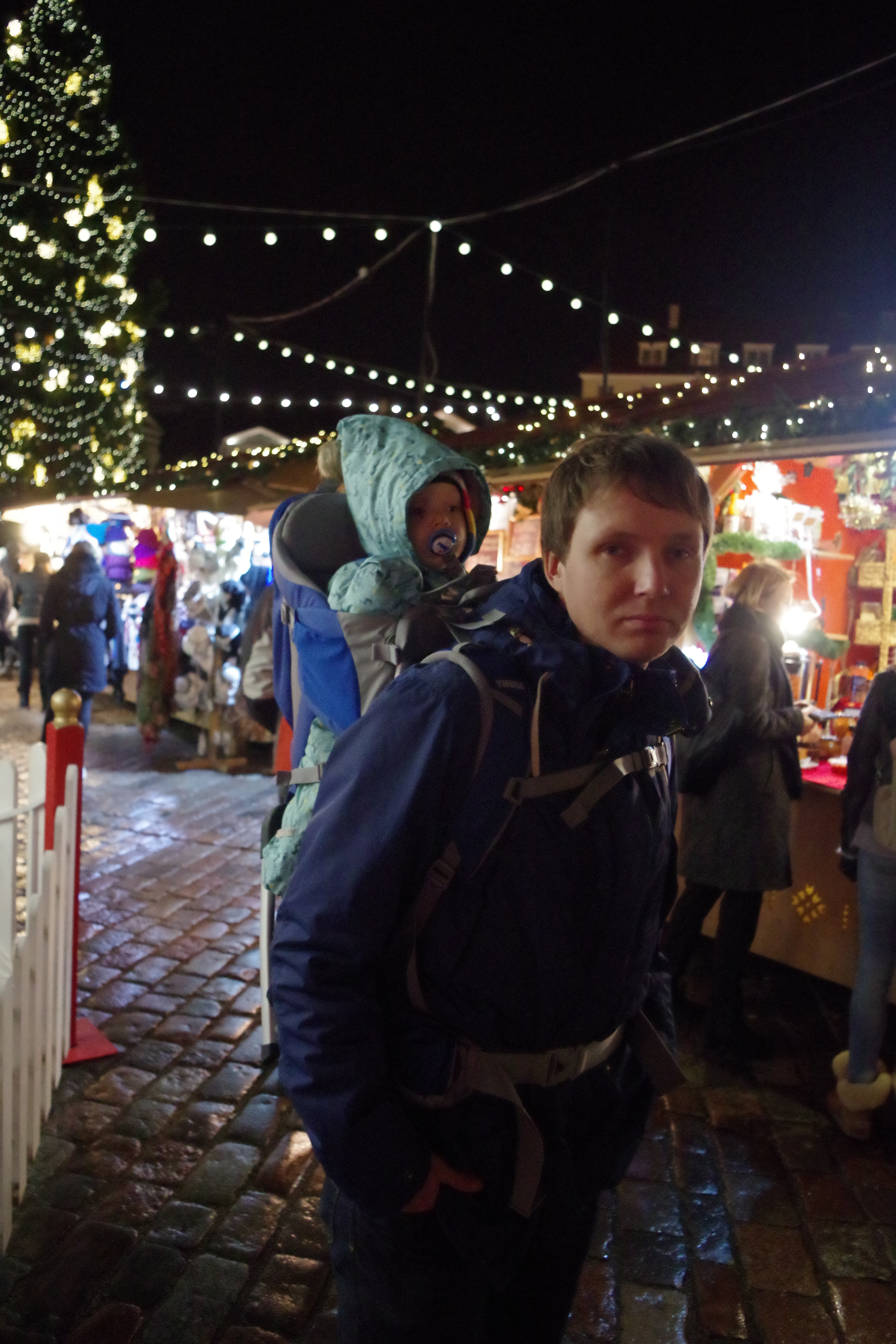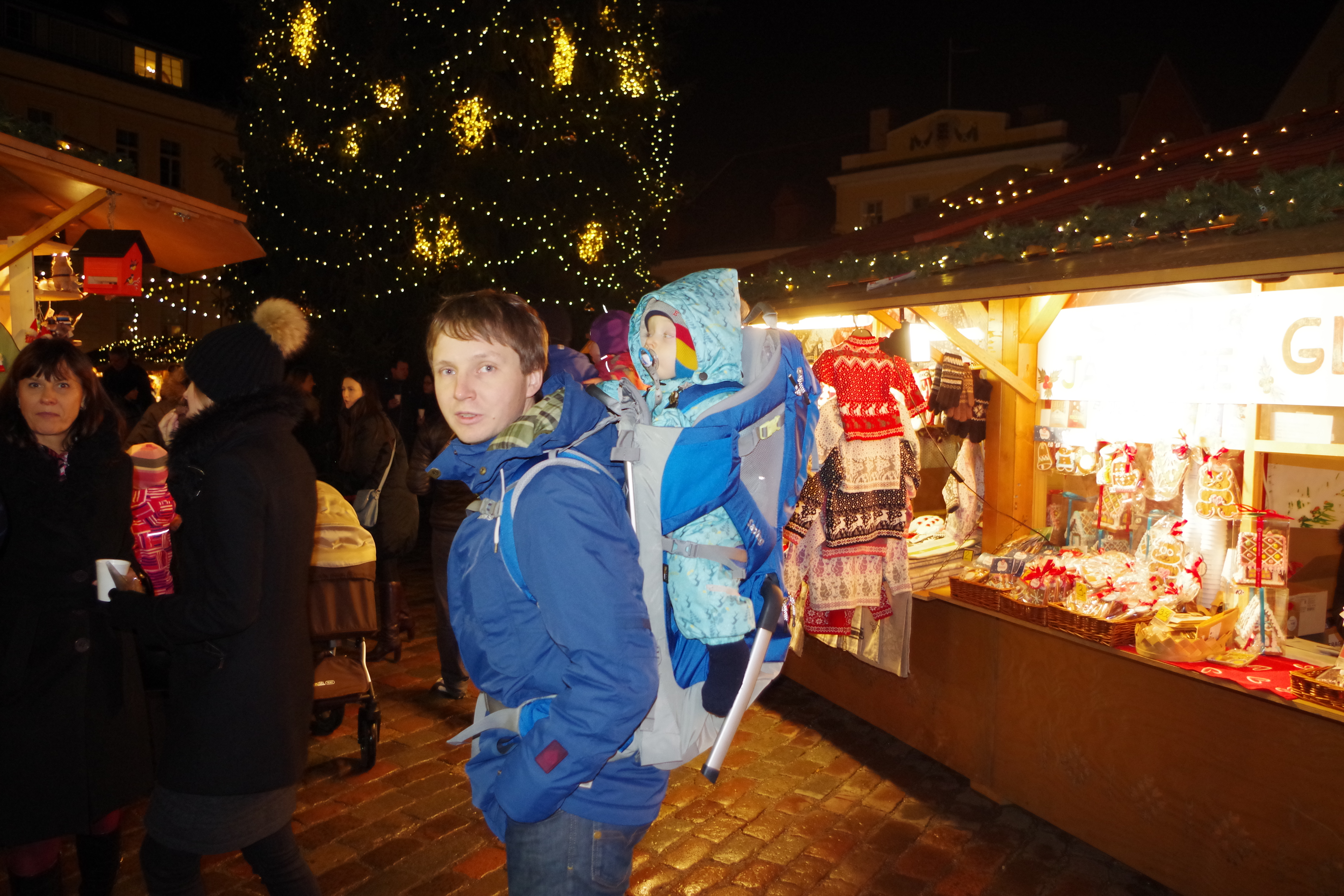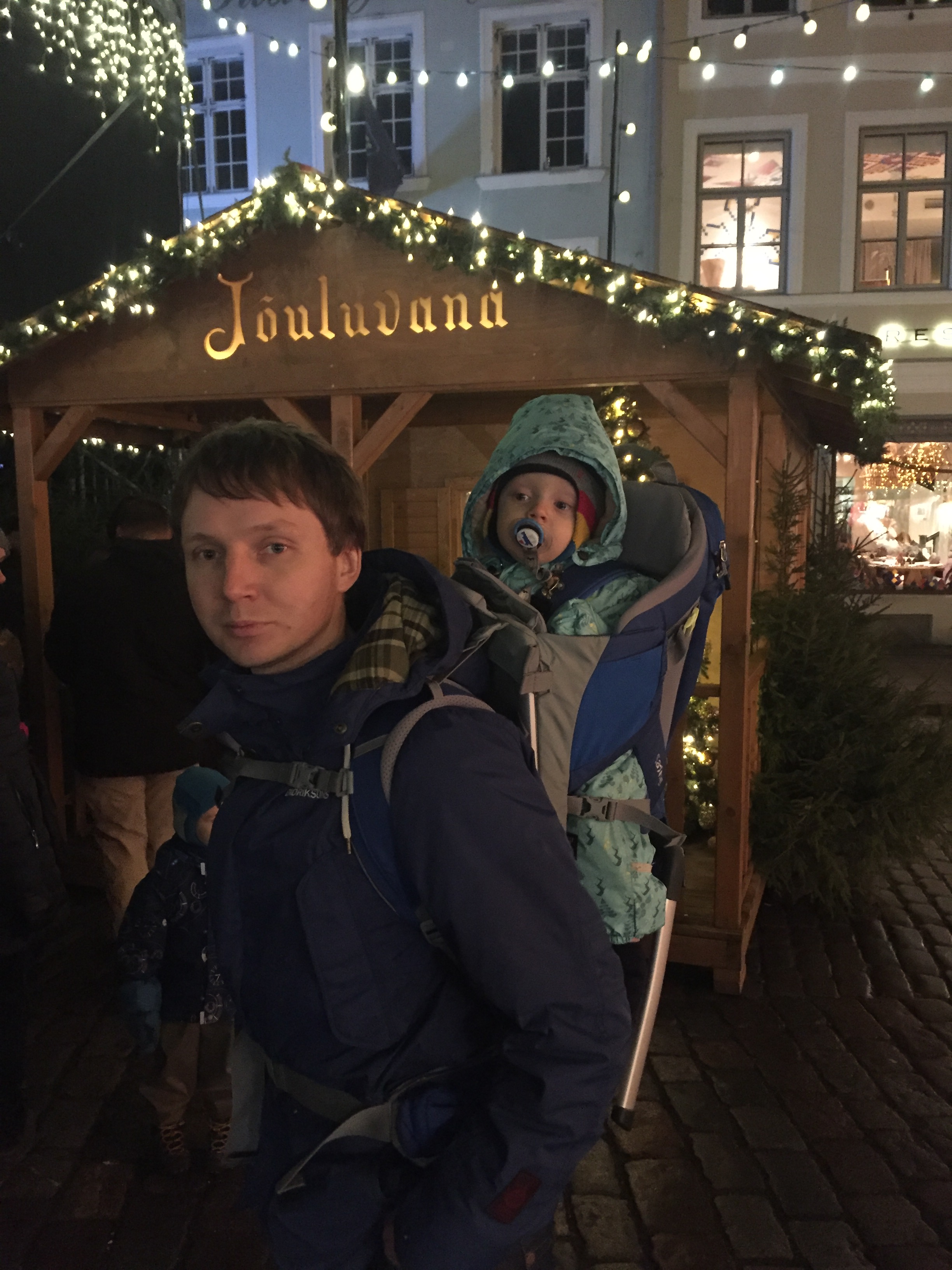 Saime Autoeksperdilt testimiseks Thule lapsekandmise seljakoti, millega esialgu oli plaan minna Vana-Aasta jooks/matkale, kuid kuna ilm oli heitlik ja kord ladistas vihma, kord oli vinge tuul, siis pidasime õigemaks JJ-ga sel korral see üritus vahele jätta. Samas kotti proovida tahtsime ikka ja nii otsustasime teha väikse linnasisese jalutuskäigu, et veel viimasel advendil Raekoja platsil kuuske vaadata ja jõuluturul väike glögi võtta. Lisaks veel muidugi seik, et meil ju praegu oma käru pole, Bugaboo sai müüdud ja uus käru jõuab ehk alles hetk enne jõule meieni (ja ega käruga vanalinnas eriti mugav ei ole ka).