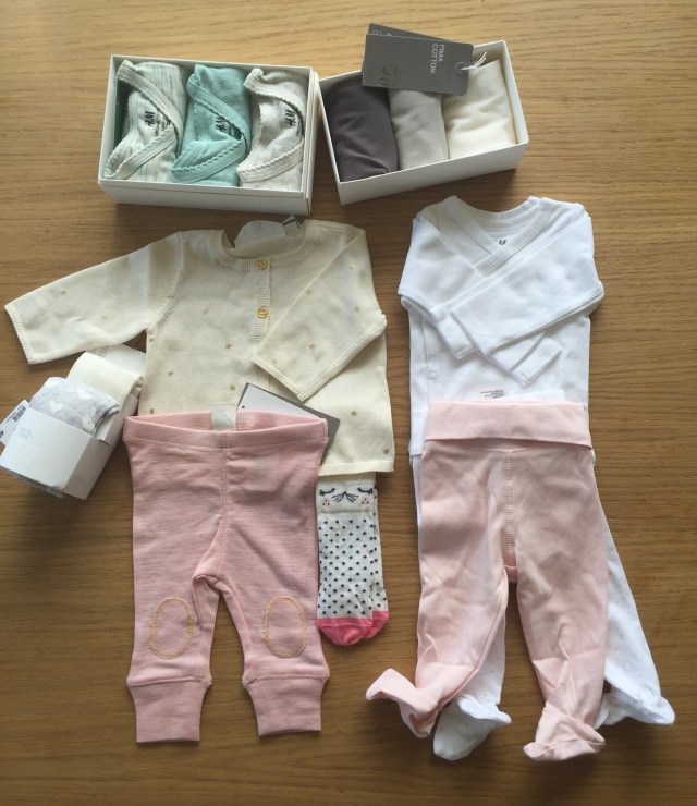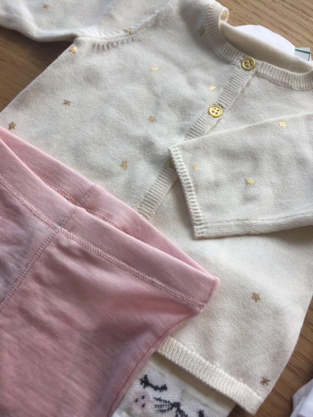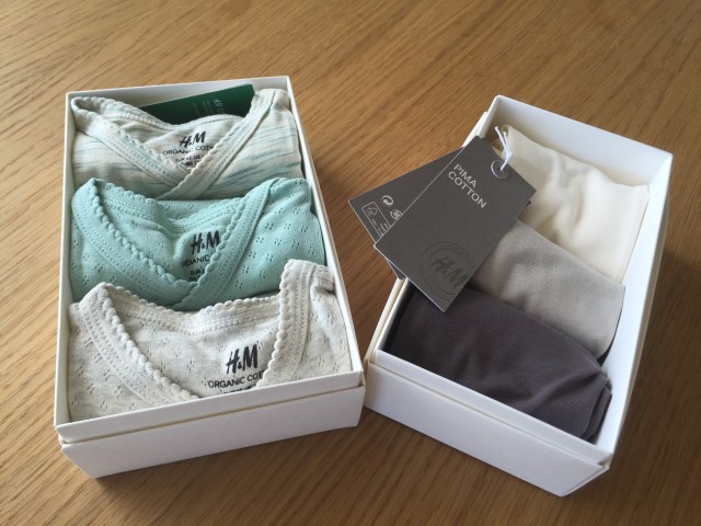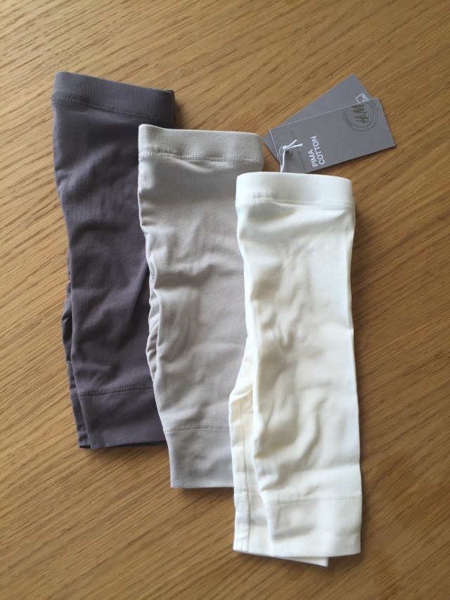 Nii nagu Lindexi puhul, on ka H&Mi kaubavalik poes ja netis veidi erinev, siuksed basic asjad on olemas mõlemas kohas, aga veidi “erilisemad” leiud peidavad end siiski e-poes. Hakkasin meie beebitüdrukule sealt asju otsima, oma beebiasjade nimekirja põhjal – esialgu oligi plaanis võtta paar hõlmik body (kuigi JJ-ga meile neid kasutada üldse ei meeldinud, siis otsustasime, et igaks juhuks ikka võtame mõned, äkki nüüd meeldivad rohkem) ja mõned kinniste otstega püksid. Siis avastasin aga, et neil seal saadaval mingi täiesti eraldi sari, kus asjad kolme kaupa pakis – leidsin väga armsad bodyd ja retuusid ning eriti suur oli mu üllatus, kui nägin valikus ka villaseid retuuse. Kõik see kraam läks muidugi kohe ostukorvi, lisaks veel üks imeilus kuldsete tähekestega kampsik, ühed tõeliselt minid põlvikud, 2 paari sukapükse (sest no kleite peab ju millegagi kandma) ja siis  ka esilagu plaanis olnud bodyd ja sipukad-retuusid.