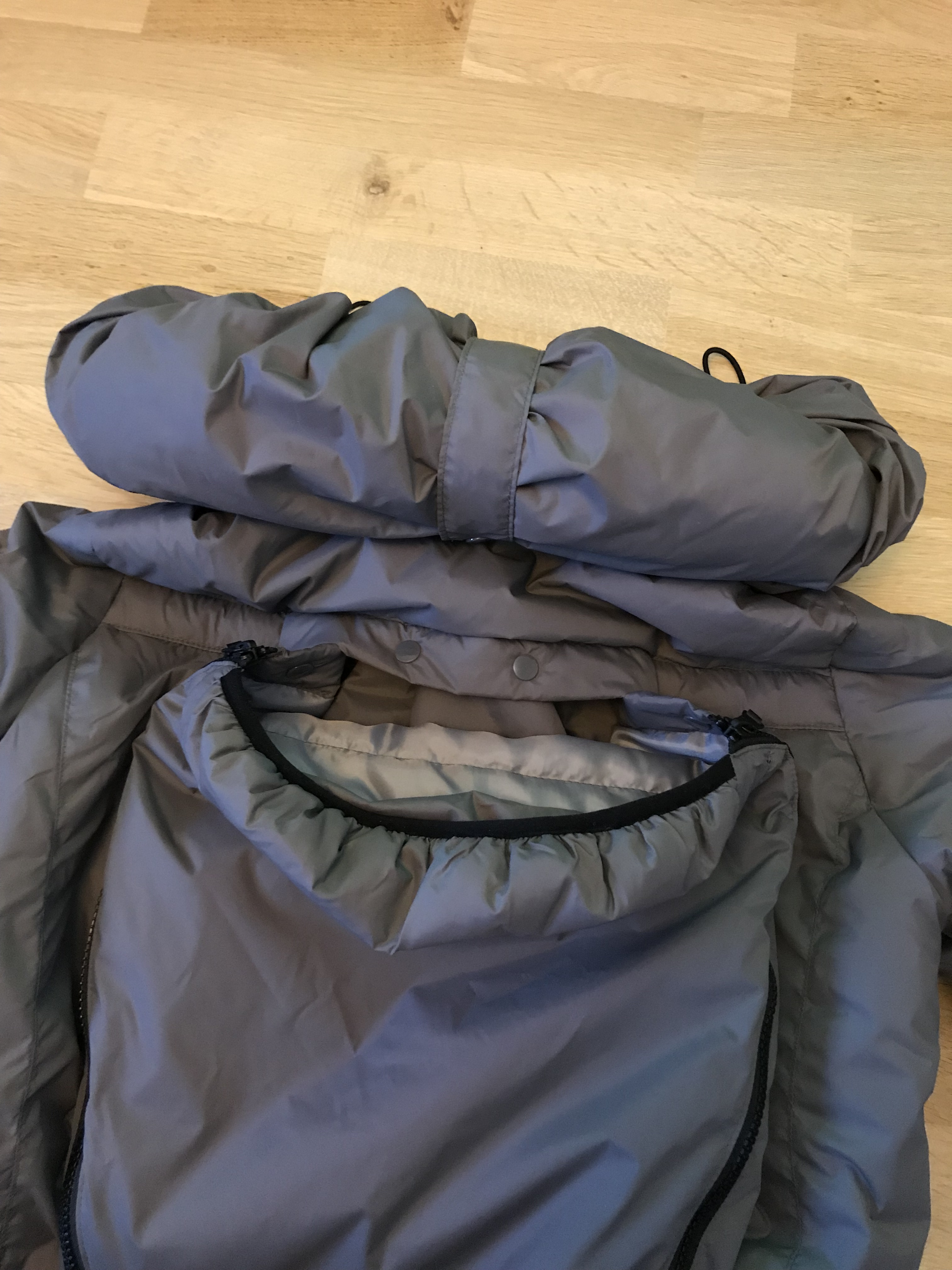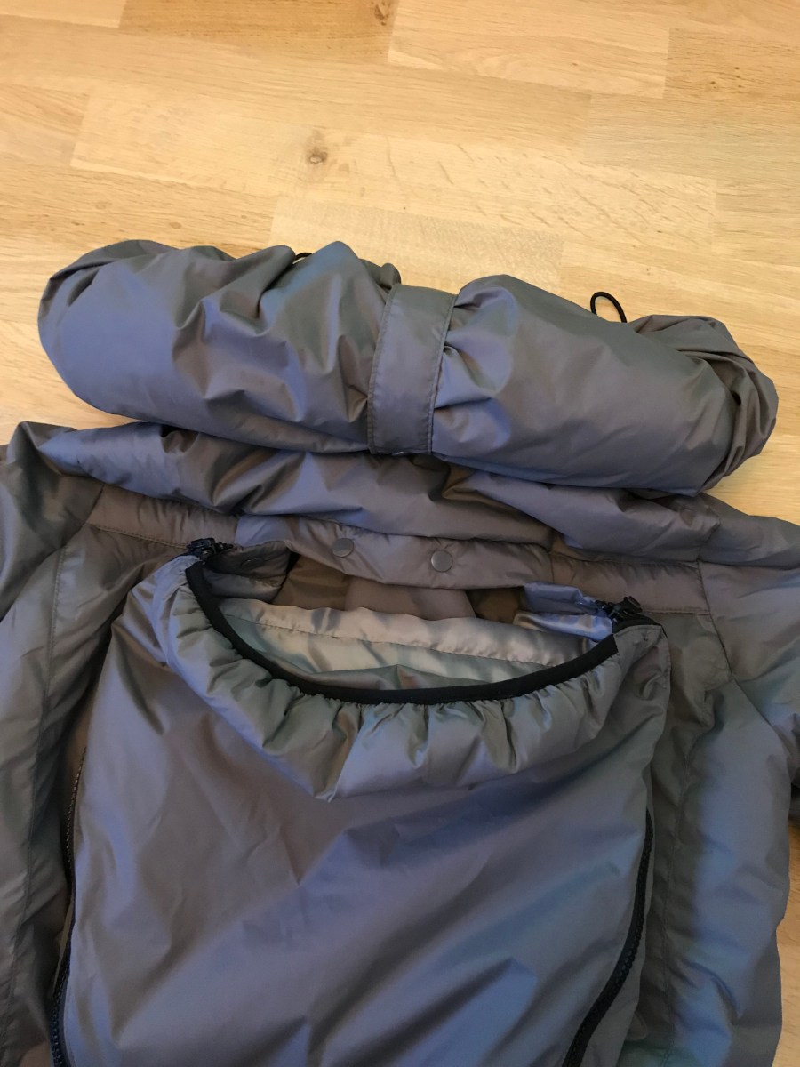 IMG_7299 Published December 23, 2018 at 3024 × 4032 in Lapsekandmine: AngelWings talvemantel « Previous Next » kokku rullitud ja kinnitatud kapuuts seljal kandmise ajal