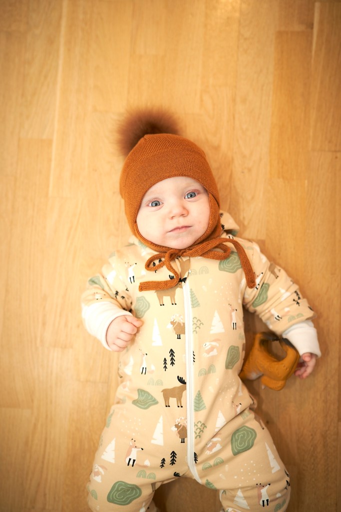 Jonas ongi selle kombega teinud mõnusaid pikki unesid soojakotis, olenemata ilmast ja sama hästi sobib see ka autosõitudeks või lapsekandmiseks (eriti head on seal juures need pikad soonikud jalgadel, et püksid kotis või linas ka üles ei roniks ja sääred paljad poleks).
