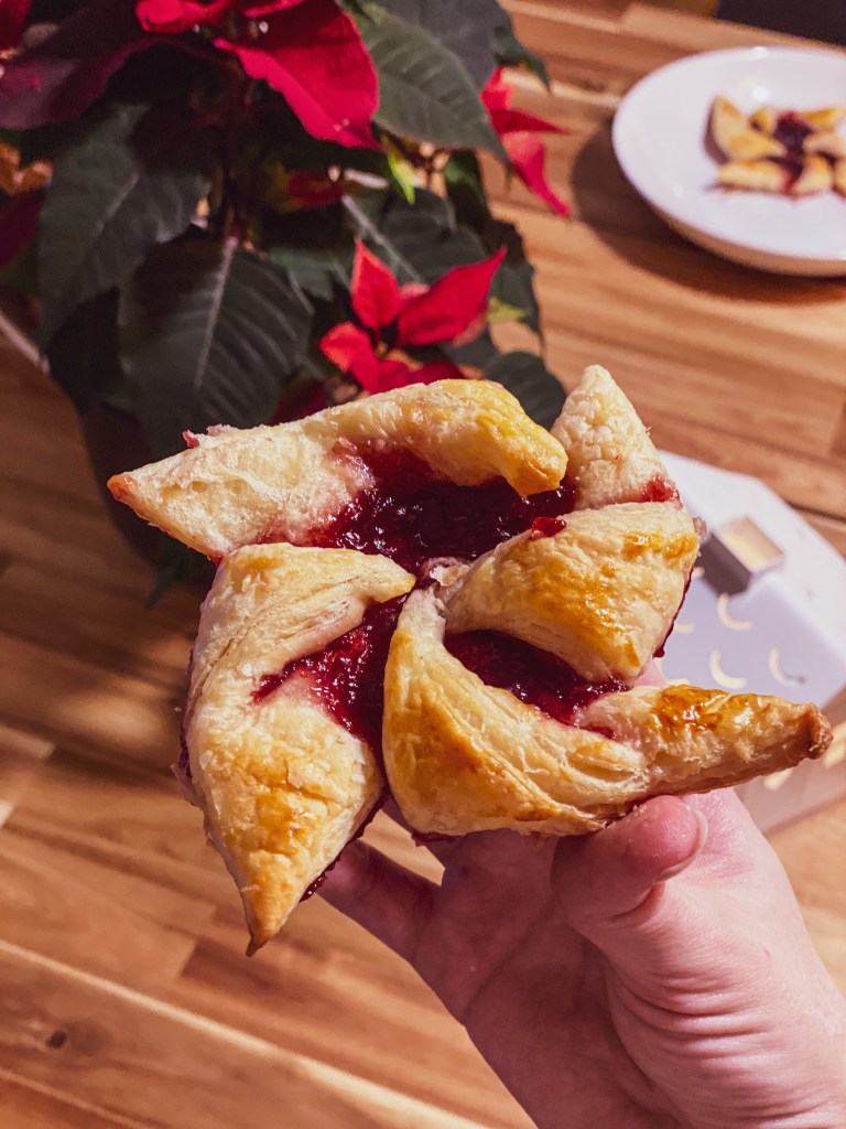 Päeval kuulasime jõululaule, kraamisime natuke elamist ja tegime jõulusööke. Ma pole eriline seaprae inimene ja kuna suurt pidu ei teinud, siis sel korral saime õhtusöögi tehtud ilma selleta. Kõhud sellest tühjemad ei olnud ja hästi maitsesid nii verivorstid kui ka pardifilee. Magusaks oli varutud sefiirtort, mis kangesti kaunistuste poolest Elsa ja Anna seiklustega sobis, aga juurde küpsetasime lastega ka jõulutähe saiakesi. Ma ei hakanud endale neid sihte nii kõrgele seadma, et ise ka tainas teha, seega kasutasime poest ostetud pärmi-lehttainast ja kirsimoosi ning tulemus oli maitsev ja lastel tegemisest rõõmu palju (need on hästi jõukohased küpsetised lastele ise tegemiseks, väikse abiga), eriti kui piparkooke on juba küll tehtud.